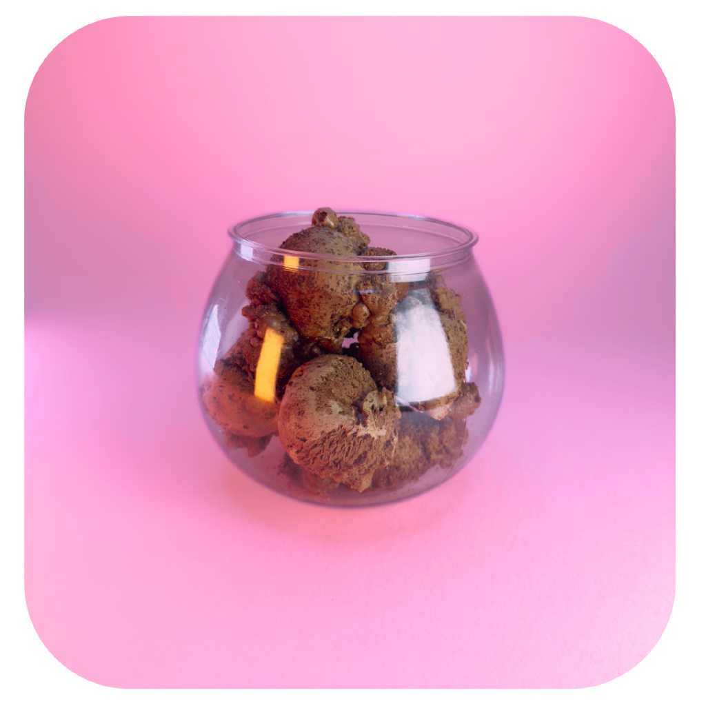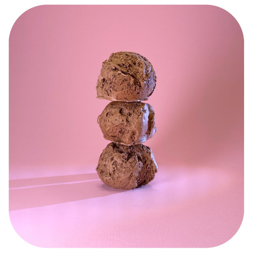 Mrazem sušené kopečky zmrzliny v příchuti Belgické čokolády. Lyofilizace promění texturu zmrzliny v křehké kousky a zároveň uchová jejich chuť.