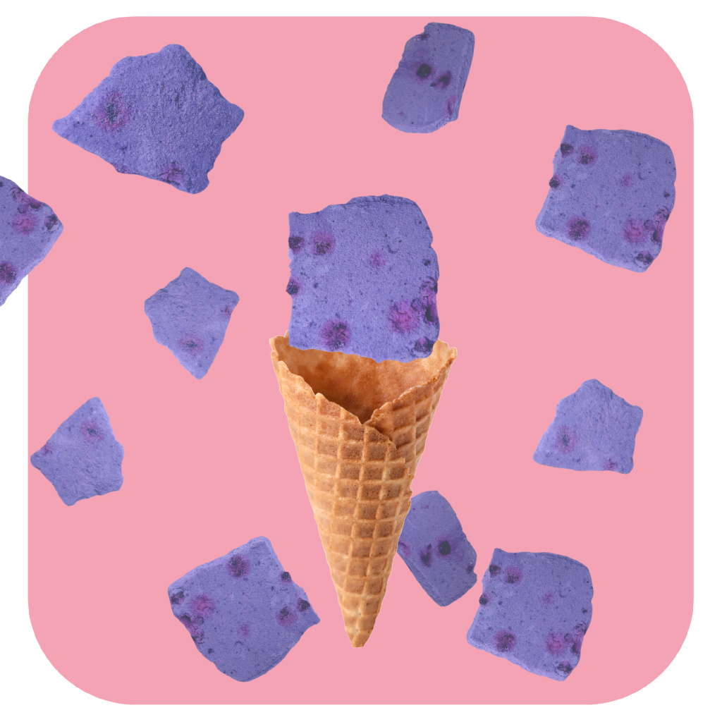 Mrazem sušené kousky zmrzliny s příchutí Borůvek.