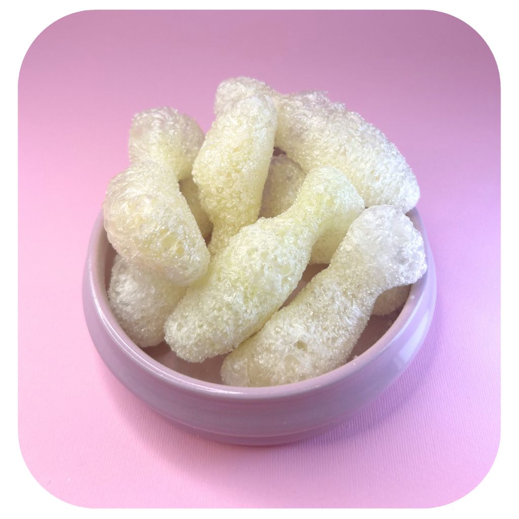 Glukózový sirup, cukr, pitná voda, jablečná šťáva z koncentrátu 5 %, želatina, modifikovaný bramborový škrob, kyseliny (kyselina mléčná, jablečná, vinná, citronová), aromata (jablko, citrón), regulátor kyselosti (askorban sodný), extrakt spiruliny, koncentrát světlice barvířské, barvivo (kurkumin).