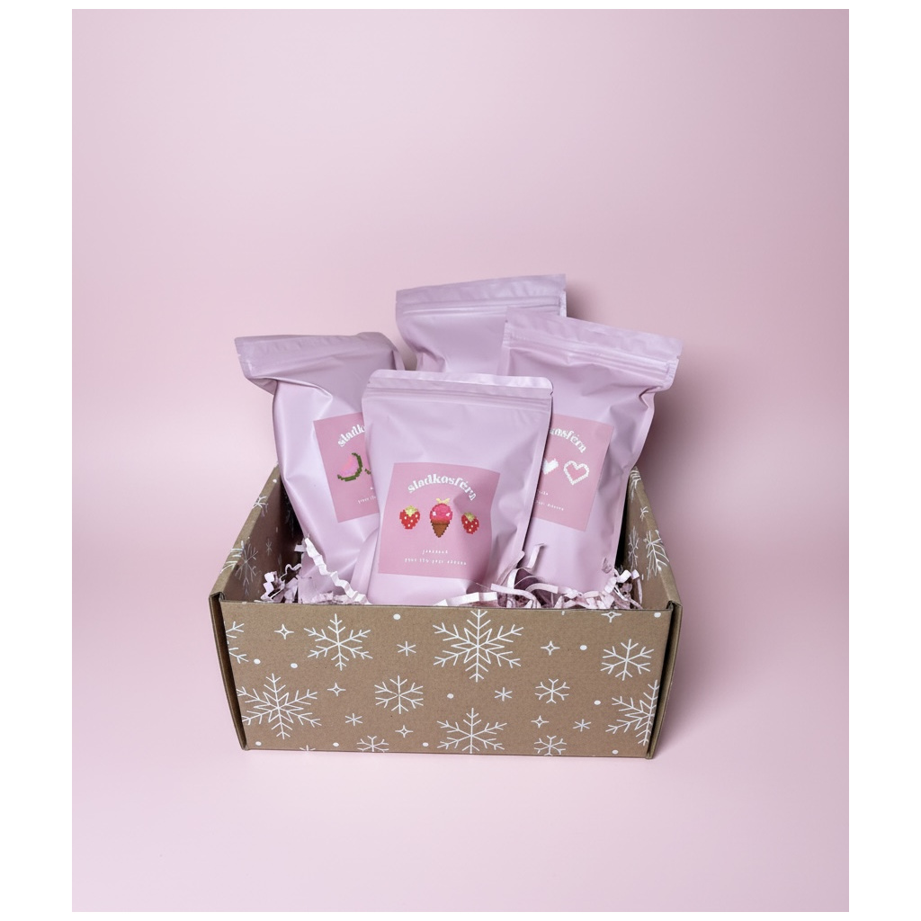 Dárková krabice obsahuje čtyři balení lyofilizovaných bonbónů a zmrzliny.