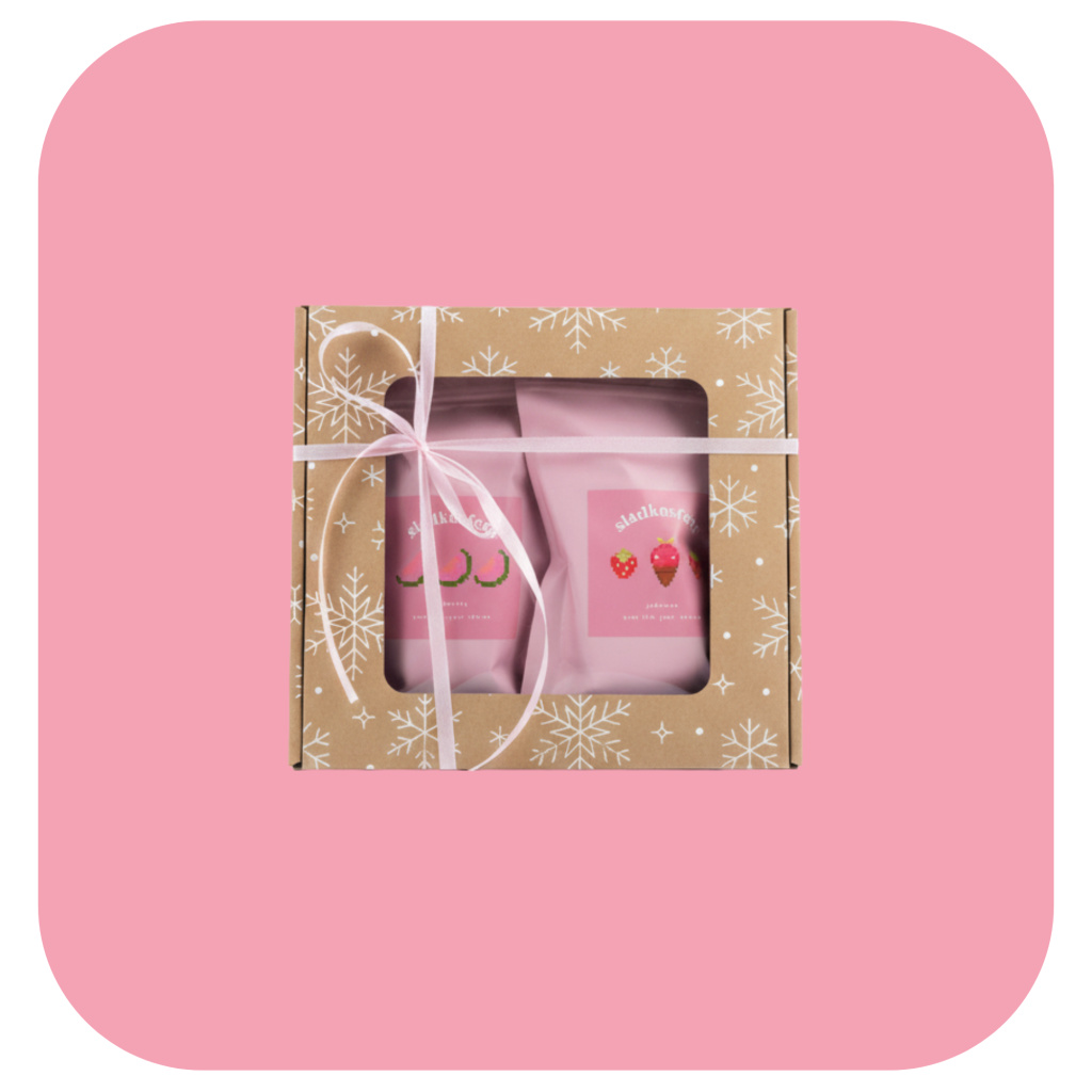 Je vyrobena z hnědého (kraftového) kartonu a má průhledné okénko, kterým je vidět obsah. Je potištěná bílými sněhovými vločkami, což jí dodává zimní/sváteční vzhled. Krabička je převázaná světle růžovou stuhou, uvázanou do mašle, což dotváří dojem dárku.